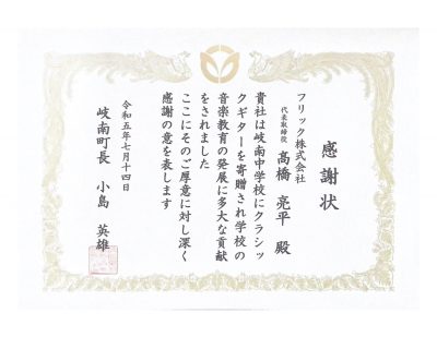フリック株式会社は岐南町立岐南中学校へクラシックギター10本の寄贈を行いました。